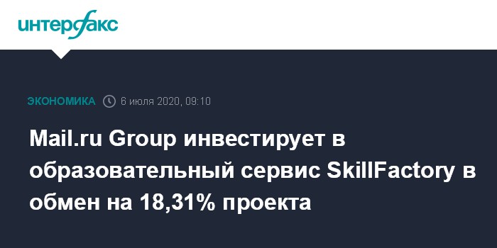 Москва. 6 июля. INTERFAX.RU - Mail.ru Group инвестирует в образовательный онлайн-сервис SkillFactory в обмен на 18,31-процентную долю в проекте, говорится в пресс-релизе интернет-холдинга. Mail.ru Group также получит опцион на приобретение дополнительных акций SkillFactory.