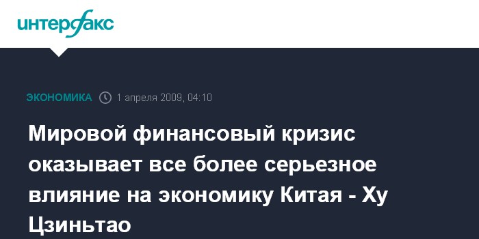 Мировой финансовый кризис оказывает все более серьезное влияние на экономику Китая - Ху Цзиньтао