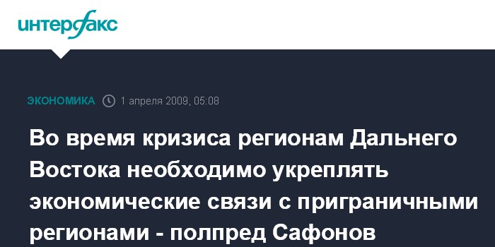 Хабаровск. 1 апреля. ИНТЕРФАКС - ДАЛЬНИЙ ВОСТОК - В условиях мирового финансового кризиса регионам Дальнего Востока необходимо укреплять торгово-экономические отношения с приграничными регионами сопредельных государств, считает полпред президента РФ в Дальневосточном федеральном округе Олег Сафонов.