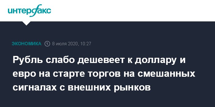 Как отмечают эксперты "Интерфакс-ЦЭА", рубль слабо дешевеет к доллару и евро на старте торгов на фоне неоднозначных сигналов с внешних рынков и умеренно дешевеющей нефти. Трейдеры с оптимизмом реагируют на воодушевляющие экономические данные, но по-прежнему испытывают обеспокоенность в связи с пандемией, что объясняет движение рынка. Опасения, связанные с возможным возвратом ограничительных мер в случае второй волны пандемии, сдерживают аппетит к риску.