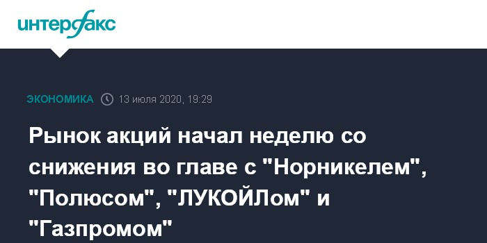 Москва. 13 июля. INTERFAX.RU - Рынок акций РФ начал неделю со снижения индексов на бумагах "Полюса", ЛУКОЙЛа", "Газпрома" и упавшими бумагами "Норникеля" на новостях о разливе у "дочки" ГМК керосина на Таймыре; внешние фондовые площадки при этом подавали позитивные сигналы.