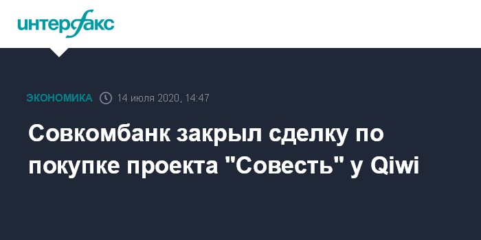 Москва. 14 июля. INTERFAX.RU - Совкомбанк объявил о завершении сделки по покупке проекта "Совесть" у Qiwi.