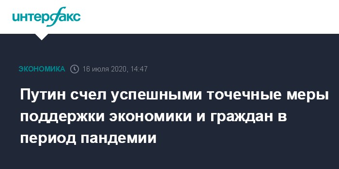 Москва. 16 июля. INTERFAX.RU - Точечные меры поддержки граждан и экономики в условиях распространения коронавируса оказались успешными и позволили сгладить остроту кризиса, считает президент РФ Владимир Путин.