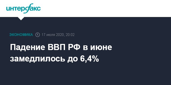 Москва. 17 июля. INTERFAX.RU - Падение ВВП РФ в июне 2020 года оценивается в 6,4% в годовом выражении после снижения на 10,7%, по уточненным данным, в мае (вместо 10,9%), падения на 12% в апреле, роста на 0,8% в марте, 2,7% в феврале и 1,6% в январе. Такая оценка содержится в "Картине деловой активности", опубликованной вечером в пятницу Минэкономразвития.