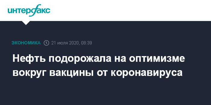 Москва. 21 июля. INTERFAX.RU - Цены на нефть эталонных марок умеренно повышаются во вторник на новостях о положительных результатах испытаний вакцины от коронавируса.