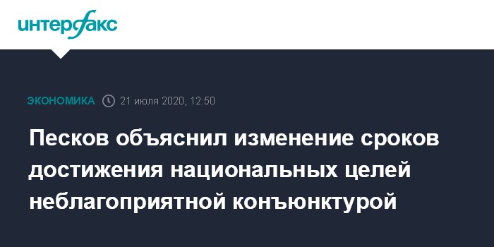 Москва. 21 июля. INTERFAX.RU - Корректировка сроков достижения национальных целей, в том числе по снижению уровня бедности в два раза к 2030 году, а не к 2024, потребовалась в связи с неблагоприятными условиями, которые складываются в последнее время, заявил пресс-секретарь президента РФ Дмитрий Песков.