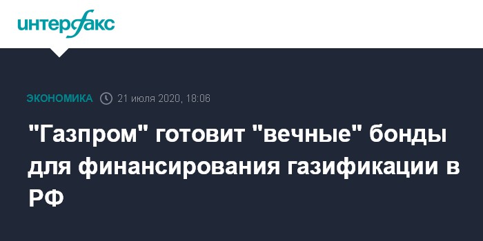 Москва. 21 июля. INTERFAX.RU - "Газпром" готовит бессрочные облигации для финансирования газификации. Об этом заявил первый замминистра экономического развития Андрей Иванов в ходе онлайн-форума "Инфраструктурные инициативы бизнеса" во вторник.