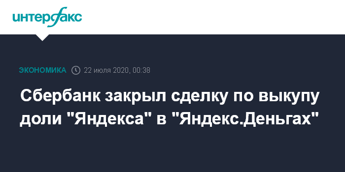 Москва. 22 июля. INTERFAX.RU - Сбербанк выкупил у "Яндекса" долю в совместном предприятии "Яндекс.Деньги", став тем самым его единственным владельцем.