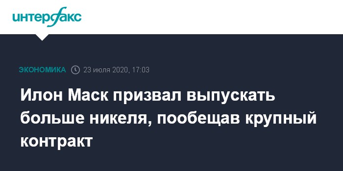 "Tesla предоставит вам гигантский долгосрочный контракт, если вы будете производить никель эффективно и безопасно для экологии", - сказал Маск, которого цитирует агентство Reuters, во время телефонной конференции по итогам второго квартала.