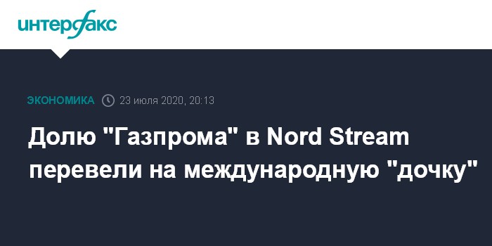 Москва. 23 июля. INTERFAX.RU - Головная компания ПАО "Газпром" перевела долю (51%) в проектной компании газопровода "Северный поток" ("Северный поток 1") Nord Stream AG на ООО "Газпром международные проекты", сообщила компания.