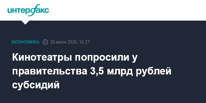 Москва. 28 июля. INTERFAX.RU - Российская ассоциация владельцев кинотеатров попросила у правительства субсидию в размере 10% от 30 млрд рублей недополученного дохода из-за пандемии, сообщил глава ассоциации Олег Березин. Он уточнил, что просят 3,5 млрд рублей на все кинотеатры.