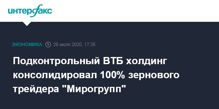 Москва. 28 июля. INTERFAX.RU - "Деметра-холдинг", в котором консолидированы зерновые активы группы ВТБ, стал владельцем 100% зернового трейдера "Мирогрупп ресурсы".