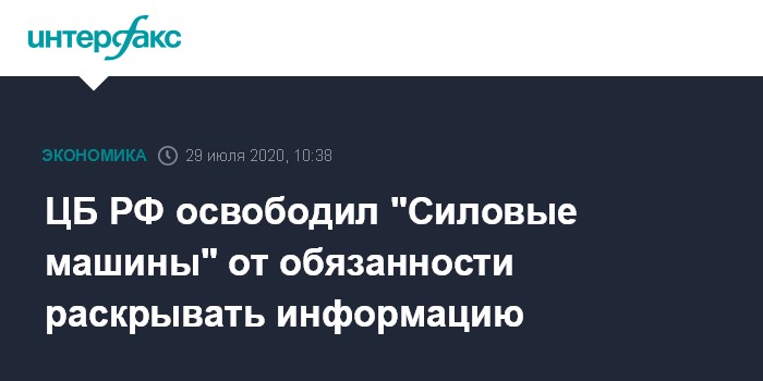 Москва. 29 июля. INTERFAX.RU - Банк России 28 июля принял решение освободить ПАО "Силовые машины" от обязанности раскрывать информацию о своей деятельности, говорится в сообщении машиностроительного концерна.