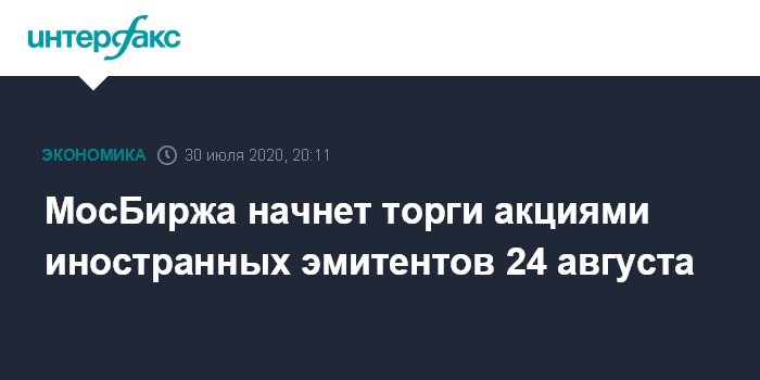 Москва. 30 июля. INTERFAX.RU - Московская биржа 24 августа начнет торги акциями иностранных эмитентов, на первом этапе инвесторам станут доступны сделки с 20 бумагами компаний, входящими в индекс S&P 500, говорится в сообщении биржи.