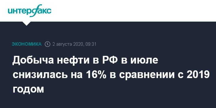 Москва. 2 августа. INTERFAX.RU - Добыча нефти с газовым конденсатом в России в июле 2020 года составила 39,63 млн тонн, что на 16% ниже уровня аналогичного месяца предыдущего года, сообщается в оперативной сводке ЦДУ ТЭК.