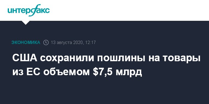 Москва. 13 августа. INTERFAX.RU - США сохранили пошлины на товары из Евросоюза объемом $7,5 млрд, сообщило торговое представительство страны.