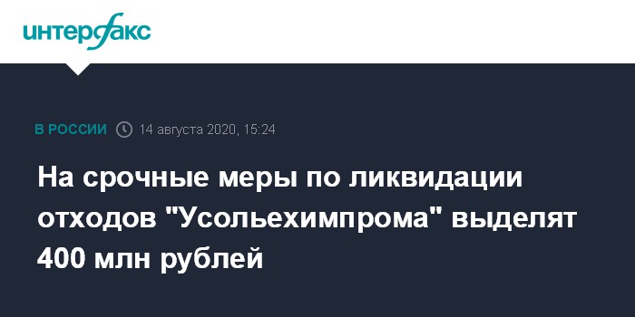 Москва. 14 августа. INTERFAX.RU - Правительство выделит в 2020 году 400 млн рублей на первоочередные меры по ликвидации отходов "Усольехимпрома" в Усолье-Сибирском. Как сообщили в пресс-службе вице-премьера Виктории Абрамченко, межведомственная рабочая группа 14 августа утвердила список первых шагов.