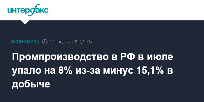 Промпроизводство в РФ в июле упало на 8% из-за минус 15,1% в добыче