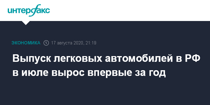 Москва. 17 августа. INTERFAX.RU - Производство легковых автомобилей в РФ в июле показало рост впервые с июля 2019 года: на 3,9%, до 113 тысяч штук. Это следует из данных Федеральной службы государственной статистики (Росстат).