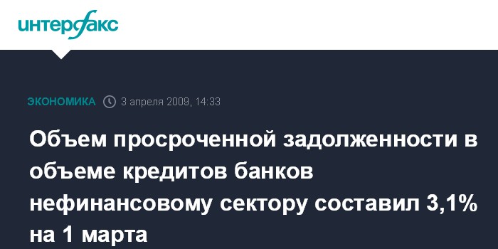 Москва. 3 апреля. INTERFAX.RU - Объем просроченной задолженности в объеме кредитов банков нефинансовому сектору составил 3,1% на 1 марта, сообщил глава ЦБ РФ Сергей Игнатьев, выступая на съезде Ассоциации российских банков. Он отметил, что на 1 сентября 2008 г. этот показатель составлял 1,0%.