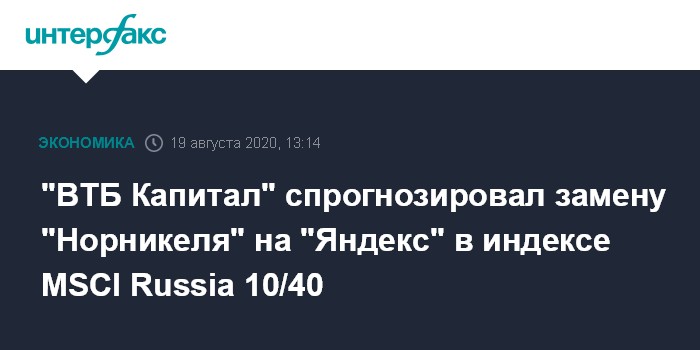 Москва. 19 августа. INTERFAX.RU - "Яндекс" может занять место ГМК "Норильский никель" в топ-4 индекса MSCI Russia 10/40 по итогам его августовской ребалансировки, говорится в обзоре главного стратега "ВТБ Капитала" по рынку акций Ильи Питерского.