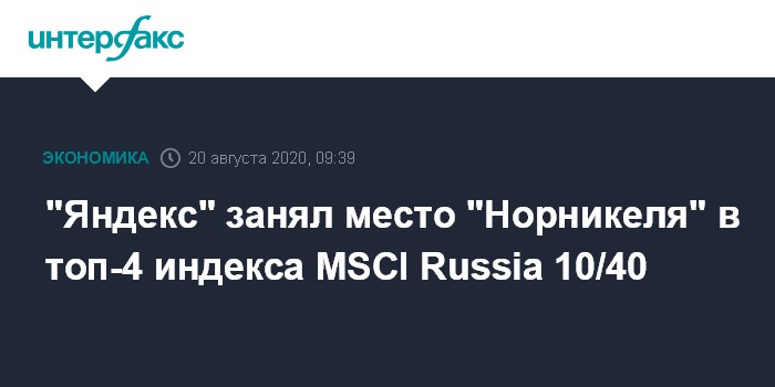 Москва. 20 августа. INTERFAX.RU - "Яндекс" занял место ГМК "Норильский никель" в топ-4 индекса MSCI Russia 10/40 по итогам его августовской ребалансировки, как и ожидалось, говорится в обзоре главного стратега "ВТБ Капитала" по рынку акций Ильи Питерского.