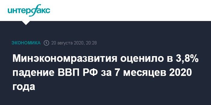 Такая оценка содержится в "Картине деловой активности", опубликованной вечером в четверг Минэкономразвития. За январь-июль 2020 года, по оценке министерства, ВВП РФ снизился на 3,8%.