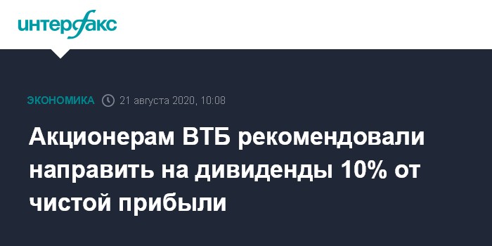 Москва. 21 августа. INTERFAX.RU - Наблюдательный совет ВТБ рекомендовал выплату дивидендов в размере 10% от чистой прибыли банка по МСФО за 2019 год, или 20,12 млрд рублей, говорится в материалах банка.