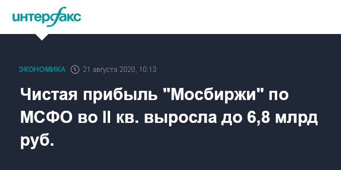 Москва. 21 августа. INTERFAX.RU - Московская биржа по итогам второго квартала 2020 года получила 6,82 млрд рублей чистой прибыли, что на 15,5% больше, чем в апреле-июне 2019 года, говорится в сообщении биржи.