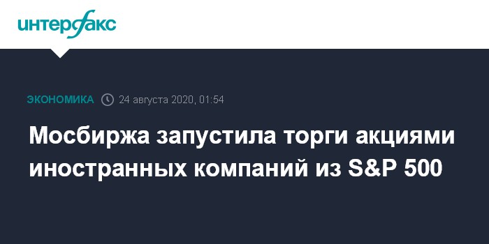 Москва. 24 августа. INTERFAX.RU - "Московская биржа" с понедельника запускает торги акциями иностранных компаний, входящих в индекс S&P 500.