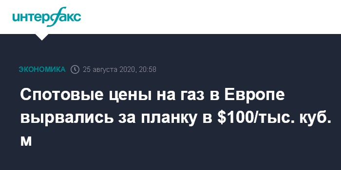 Москва. 25 августа. INTERFAX.RU - Спотовые цены на газ в Европе после проседания в конце прошлой недели начали последнюю неделю лета новым энергичным рывком вверх, вырвавшись за уровень $100 за тысячу кубометров.