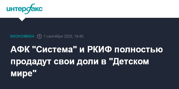 Москва. 1 сентября. INTERFAX.RU - ПАО АФК "Система" совместно с Российско-китайским инвестиционным фондом (РКИФ, создан РФПИ и China Investment Corporation) объявили о продаже своих долей в ПАО "Детский мир".