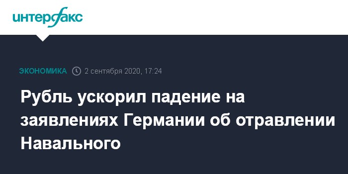Москва. 2 сентября. INTERFAX.RU - Рубль заметно ускорил падение к доллару и евро вечером в среду, резко негативно отреагировав на заявление официального представителя правительства Германии Штеффена Зайберта о том, что оппозиционера Алексея Навального отравили в РФ нервнопаралитическим боевым веществом.