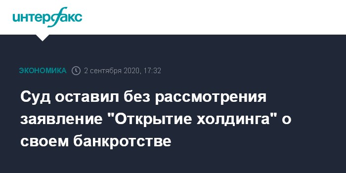Москва. 2 сентября. INTERFAX.RU - Арбитражный суд Москвы оставил без рассмотрения заявление "Открытие холдинга" о собственном банкротстве, передал корреспондент "Интерфакса" из суда.