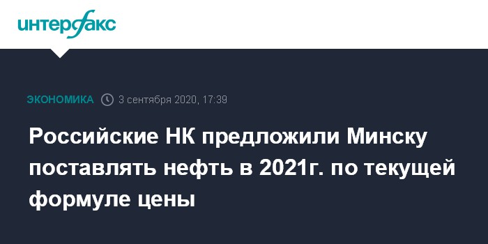 Москва. 3 сентября. INTERFAX.RU - Российские нефтяные компании вступили в переговоры с "Белнефтехимом" по условиям поставки нефти в 2021 году и подтверждают неизменность формулы ценообразования, передает государственное агентство БелТА.