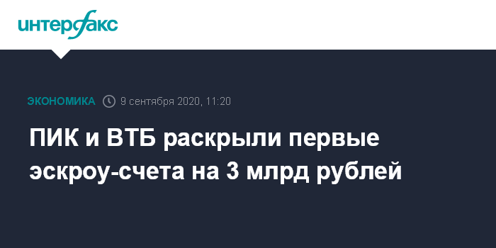 Москва. 9 сентября. INTERFAX.RU - "Группа компаний ПИК" и банк ВТБ провели первое раскрытие эскроу-счетов в Москве, объем перечисленных средств составляет 3 млрд рублей, сообщил девелопер.