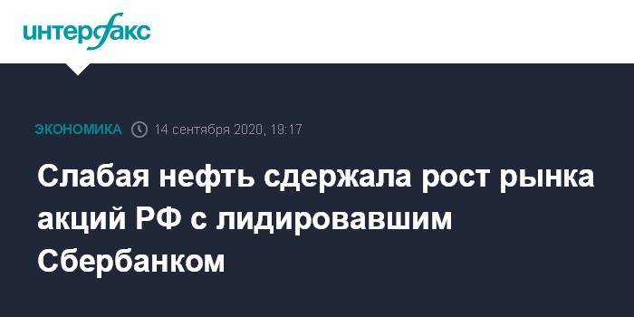 Москва. 14 сентября. INTERFAX.RU - Рынок акций РФ в понедельник продолжил рост вслед за внешними площадками на новостях о возобновлении испытаний вакцины от COVID-19 компанией AstraZeneca, подъем сдерживался дешевеющей нефтью; лидировали бумаги Сбербанка, при этом реакция рынка на новости с проходящих в Сочи переговоров президентов России и Белоруссии оказалась нейтральной.