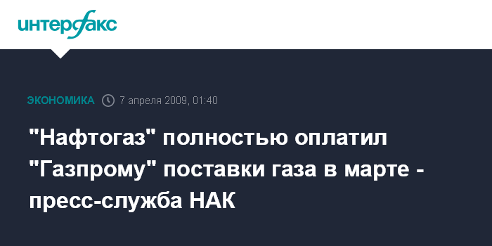 Киев. 7 апреля. ИНТЕРФАКС-УКРАИНА - Национальная акционерная компания (НАК) "Нафтогаз Украины" перечислила ОАО "Газпром" средства за поставленный российской компанией в марте природный газ, сообщил агентству "Интерфакс-Украина" руководитель пресс-центра НАК Валентин Землянский.