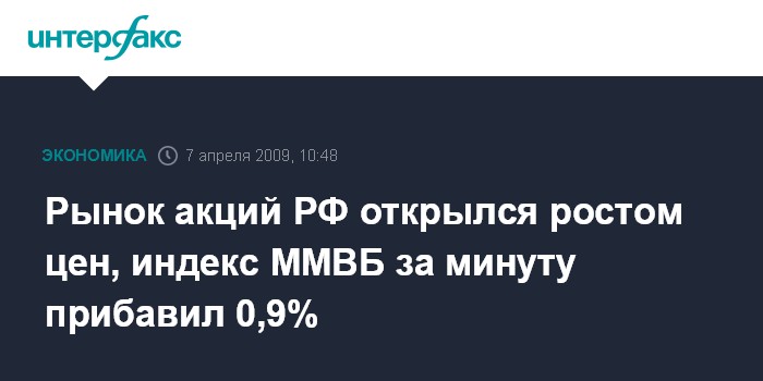 Москва. 7 апреля. INTERFAX.RU - Российский рынок акций открылся во вторник ростом цен большинства blue chips следом за нефтью, индекс ММВБ за минуту торгов прибавил 0,9%.