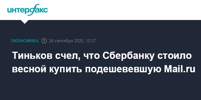 Тиньков счел, что Сбербанку стоило весной купить подешевевшую Mail.ru