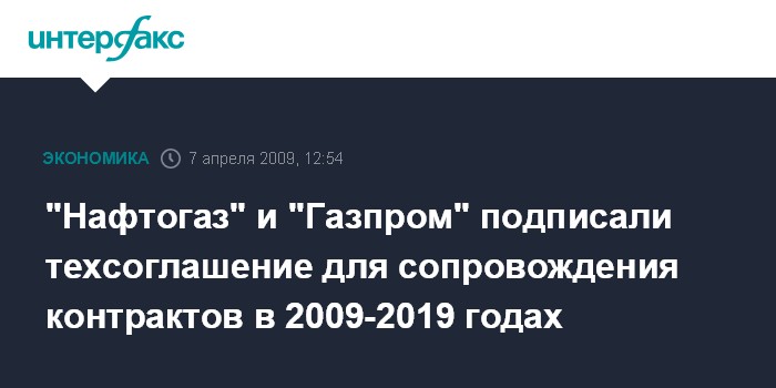 Москва. 7 апреля. INTERFAX.RU - Национальная акционерная компания "Нафтогаз Украины" и ОАО "Газпром" на переговорах в Москве 6 апреля согласовали технические условия выполнения подписанных в январе этого года контрактов на поставку и транзит природного газа на 2009-2019 годы.