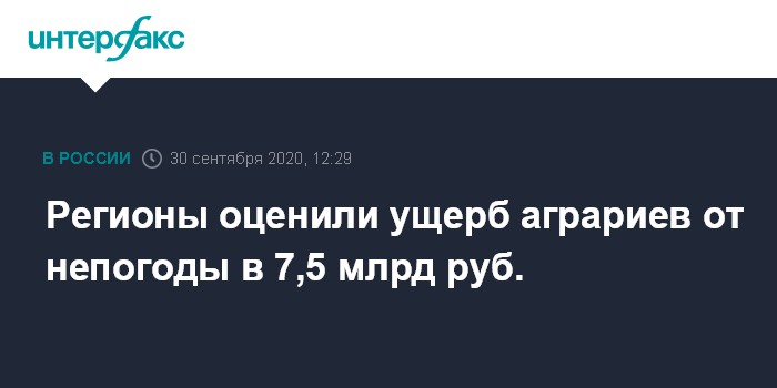 Москва. 30 сентября. INTERFAX.RU - Ущерб сельхозпроизводителей РФ в этом году от непогоды оценивается в 7,5 млрд рублей.