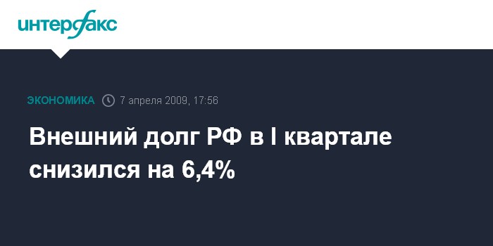Москва. 7 апреля. INTERFAX.RU - Внешний долг РФ за первый квартал 2009 года, по оценке ЦБ РФ, сократился на 6,4% и составил $453,5 млрд ($484,7 млрд на 1 января 2009 года), говорится в материалах Банка России, опубликованных на его сайте.