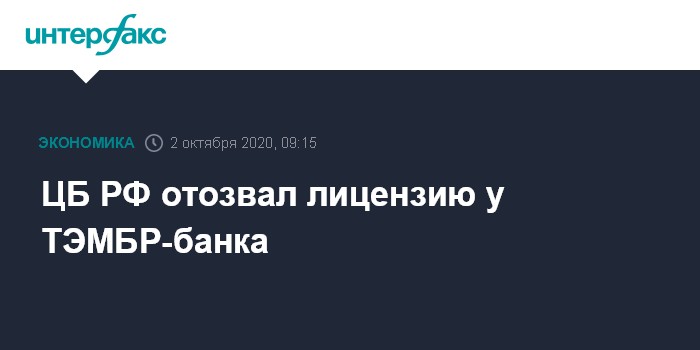 Лицензия отозвана со 2 октября. Согласно пресс-релизу ЦБ, ТЭМБР-банк, зарегистрированный в Москве, занижал величину необходимых к формированию резервов на возможные потери, допускал нарушения в области противодействия легализации (отмыванию) доходов, полученных преступным путем.