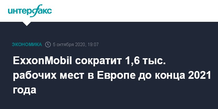 Москва. 5 октября. INTERFAX.RU - Американская нефтегазовая компания Exxon Mobil Corp планирует сократить порядка 1,6 тысяч рабочих мест в Европе до конца 2021 года.