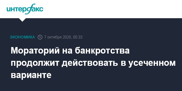 Москва. 7 октября. INTERFAX.RU - Мораторий на возбуждение дел о банкротстве по требованию кредиторов продолжит действовать до 7 января 2021 года для компаний и индивидуальных предпринимателей из отраслей, которые сильнее всего пострадали от пандемии коронавируса. Мораторий больше не распространяется на системообразующие и стратегические организации.