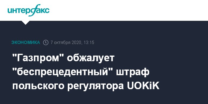 Москва. 7 октября. INTERFAX.RU - "Газпром" принципиально не согласен с позицией польского антимонопольного органа (UOKiK) и вынесенным им 6 октября 2020 года решением о наложении на монополию штрафа в размере около 6,467 млрд евро, собирается обжаловать этот штраф, говорится в заявлении компании.