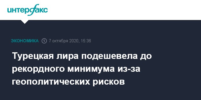 Москва. 7 октября. INTERFAX.RU - Турецкая лира в среду подешевела до рекордного минимума в паре с долларом на фоне резкого роста геополитических рисков в регионе.