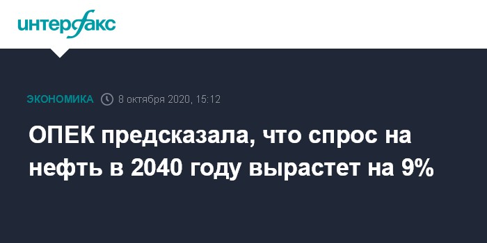 Москва. 8 октября. INTERFAX.RU - Организация стран-экспортеров нефти (ОПЕК) ожидает увеличения мирового спроса на нефть к 2040 году на 9% - до 109,3 млн б/с, говорится в ежегодном прогнозе картеля World Oil Outlook (WOO).