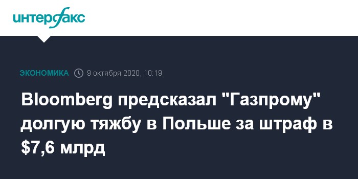 Москва. 9 октября. INTERFAX.RU - Процесс обжалования "Газпромом" штрафа в $7,6 млрд, назначенного польским антимонопольным ведомством UOKiK займет не менее пяти лет, полагают эксперты агентства Bloomberg.